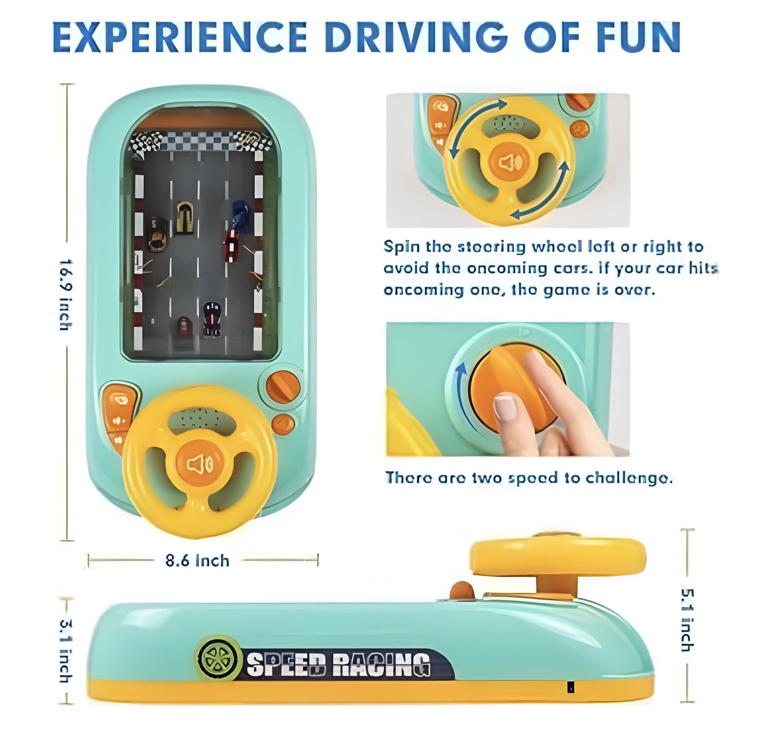 Here's how it works: The game ends if your car collides with an oncoming one, so quick steering is key! Your child can practice controlling the wheel at the starter speed before turning the dial to ramp up the excitement with the two-speed challenge mode.